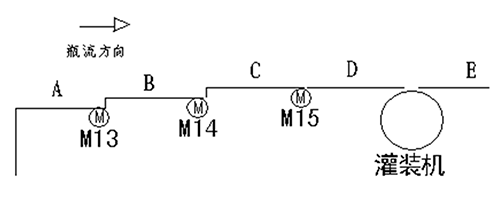 變頻器1﹑2﹑3的調(diào)速方式為兩種:1.來(lái)自灌裝機(jī)主機(jī)變頻器的模擬信號(hào)DC0~10V,經(jīng)過(guò)隔離器轉(zhuǎn)換為線性DC0~10V,再經(jīng)過(guò)電位器分壓作為變頻器1﹑2﹑3 的給定信號(hào),以控制電機(jī)M13﹑M14﹑M15,這樣可以做到輸送帶與灌裝機(jī)的速度很好匹配;2.采用多段速控制端子SD﹑STF﹑RL﹑RM﹑RH,通過(guò)PLC編程,由PLC發(fā)出控制信號(hào)以控制速度。PLC根據(jù)灌裝機(jī)操作臺(tái)發(fā)出的信號(hào)來(lái)判斷使用那種速度控制方式,又根據(jù)瓶流情況選擇高低速。在模擬信號(hào)控制時(shí)是通過(guò)輔助繼電器KA1和KA2,KA3和KA4,KA5和KA6的組合,經(jīng)W1﹑W2,W3﹑W4,W5﹑W6分壓控制變頻器輸出速度。在多段速時(shí)通過(guò)PLC的輸出Y10﹑Y11﹑Y12﹑Y13,Y20﹑Y21﹑Y22﹑Y23,Y24﹑Y25﹑Y26﹑Y27分別調(diào)節(jié)各個(gè)變頻器的輸出頻率以達(dá)到多段輸送帶的速度匹配及與灌裝機(jī)的速度匹配。在模擬控制方式調(diào)整中,電位器分壓比的調(diào)整是個(gè)關(guān)鍵,通過(guò)生產(chǎn)調(diào)試中摸索,終于找到了比較好的速度匹配。分壓比一旦調(diào)好,不得隨意改動(dòng)。