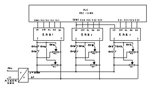 深圳某啤酒生產(chǎn)廠使用三菱變頻器FR-A540E為主要核心設(shè)備對(duì)該廠灌裝生產(chǎn)線輸瓶帶的調(diào)速要求進(jìn)行部署。三菱變頻器外部端子調(diào)速可分為模擬量調(diào)速和多段速調(diào)速。模擬量調(diào)速可用電壓DC0~10V或電流DC4~20mA,進(jìn)行無(wú)級(jí)調(diào)速。我廠用0~10V模擬電壓作為給定量 ,進(jìn)行開(kāi)環(huán)調(diào)速 ;多段速采用外部輸入端子 SD﹑STF﹑RL﹑ RM﹑RH,進(jìn)行三段速調(diào)速。RL﹑RM﹑RH是低﹑中﹑高三段速速度選擇端子,SD是輸入公共端,STF是啟動(dòng)正轉(zhuǎn)信號(hào)。如圖3中,當(dāng)Y10,Y11有輸出時(shí),變頻器為低速運(yùn)行;當(dāng)Y10,Y12有輸出時(shí),為中速運(yùn)行;當(dāng)Y10,Y13有輸出時(shí)為高速運(yùn)行。變頻器2﹑3原理與此相同。三段速分別設(shè)置為15Hz﹑30Hz﹑45Hz。在模擬量調(diào)速時(shí),通過(guò)調(diào)整W1﹑W2的分壓比設(shè)置KA1閉合時(shí)變頻器高速運(yùn)行,KA2閉合時(shí)為低速運(yùn)行,當(dāng)KA1﹑KA2都斷開(kāi)時(shí),變頻器為最高速;變頻器2﹑3原理與此相同。通過(guò)編程,PLC根據(jù)操作臺(tái)發(fā)出的信號(hào),選擇控制方式:模擬量調(diào)速或多段速調(diào)速。三菱變頻器的多段速調(diào)速比模擬量調(diào)速有較高優(yōu)先級(jí)(1)。