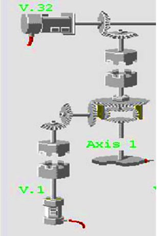 變速機(jī)控制和差速齒輪法既可離線設(shè)置也可在線調(diào)節(jié) 。連接變速機(jī)到滾筒支路,把變速機(jī)的變速比設(shè)為變量,通過(guò)調(diào)節(jié)各輥的變速比值,使其達(dá)到線速度相等。 連接差速齒輪到滾筒支路,在差速齒輪側(cè)加入輔助虛擬伺服電機(jī)使輥筒的速度得到修正 。