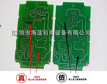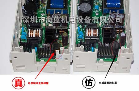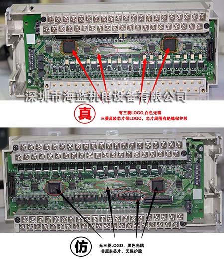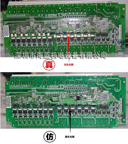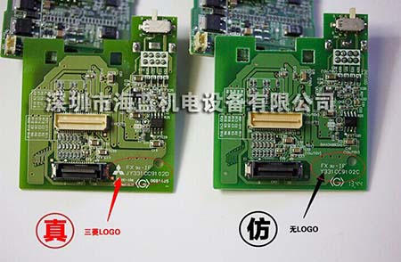 IO板上。原裝主控芯為三菱的芯片,其它如光耦,晶體管,驅動芯片均為日原廠原裝器件,而仿貨均為國產器件,外觀及其顏色很容易分辨出來