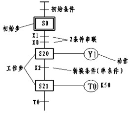 如圖所示,在初始步S0,沒有驅動動作,S20為其轉移目標,X0、X1為串聯的轉移條件;在S20步, Y1為其驅動動作,S21為其轉移目標,X2為其轉移條件。